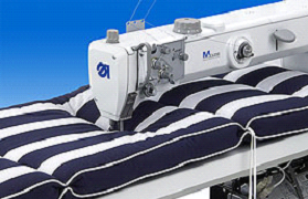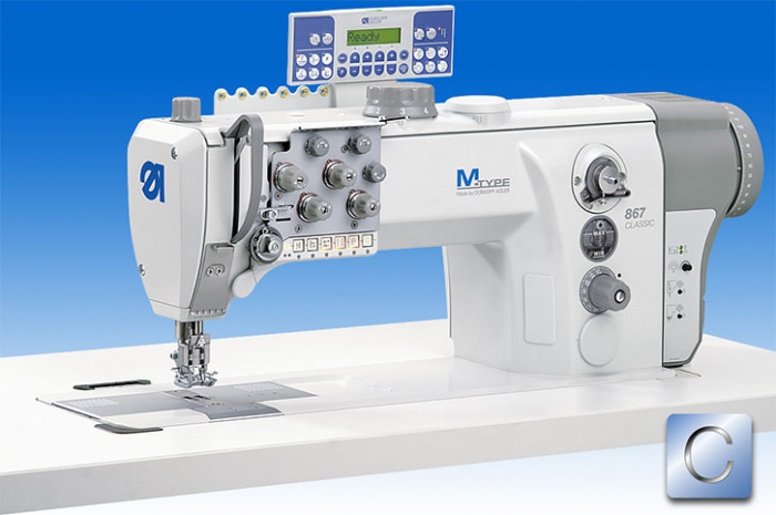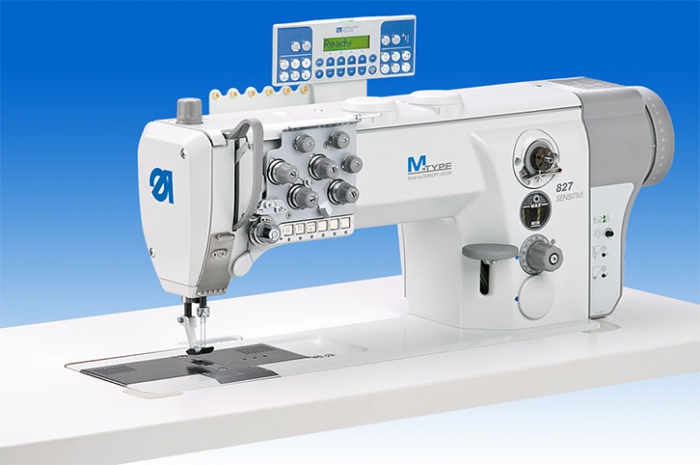 Stębnówka 2-igłowa z serii M-TYPE długoramienna o prześwicie między igłą a kolumną maszyny wynoszącym 700 mm, z transportem dolnym, igłowym i górnym stopkowym z automatyką